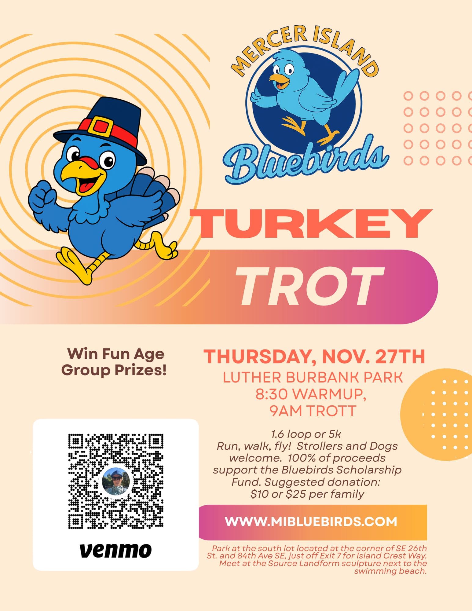Kick off your Thanksgiving morning with movement, community, and a meaningful mission! Join us for the Mercer Island Bluebirds Turkey Trot, a family-friendly run/walk supporting the Mercer Island Bluebirds Cross Country Team Scholarship Fund.